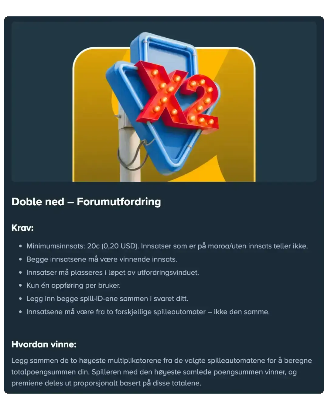 | Kampanje | Kode | Minimum Innskudd | Gevinst |